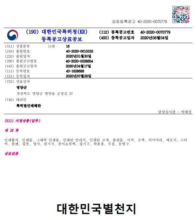 주소: 대한민국 경상북도 영양군 영양읍 서부리 특허등록사무소.