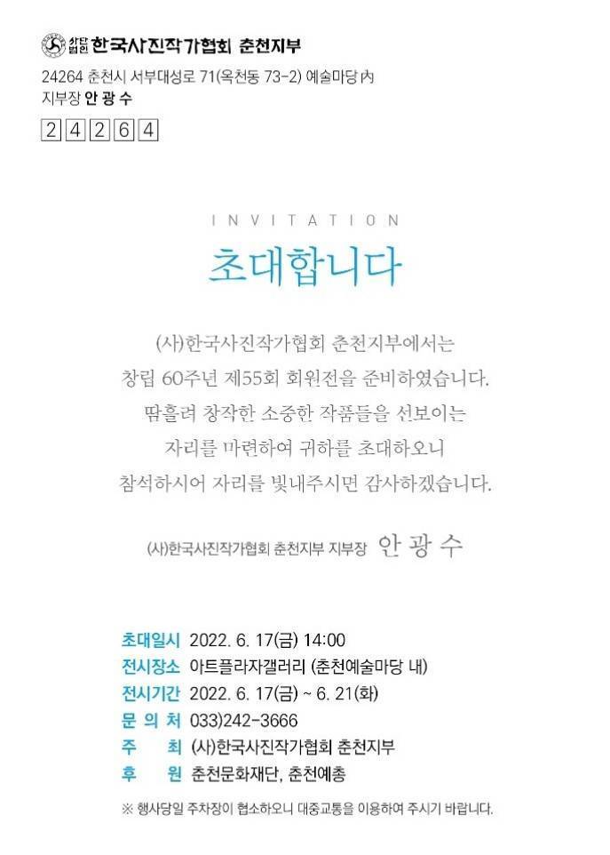 주소: 대한민국 강원특별자치도 춘천시 옥천동 73-2 한국사진작가협회 춘천지부.